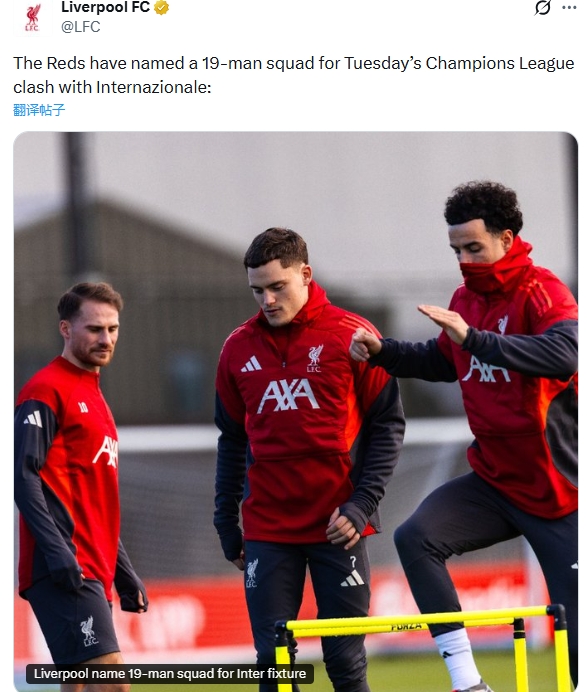 258直播12月08日消息,利物浦官方发布了欧冠对阵国际米兰的名单,其中萨拉赫和加克波未入选,维尔茨以及伊萨克则位列其中。 阿利松、戈麦斯、范戴克、科纳特、凯尔凯兹、维尔茨、索博斯洛伊、伊萨克、麦卡利斯特、布拉德利、琼斯、埃基蒂克、马马尔达什维利、罗伯逊、伍德曼、赫拉芬贝赫、尼奥尼、恩古莫哈、拉基。 比赛将在北京时间周三凌晨4点进行,利物浦将前往客场挑战国际米兰。